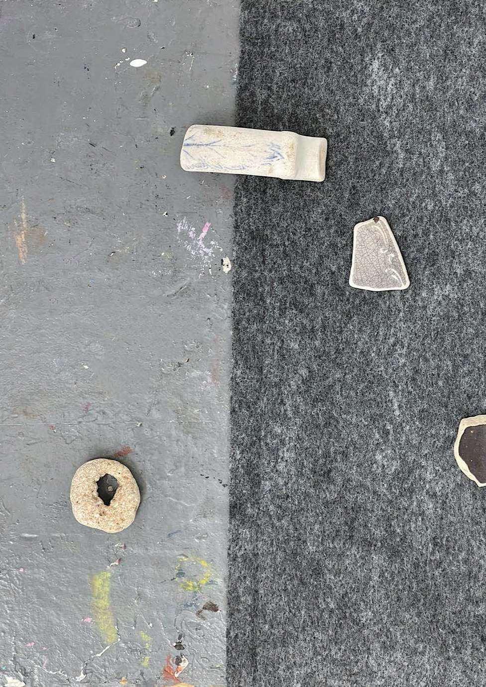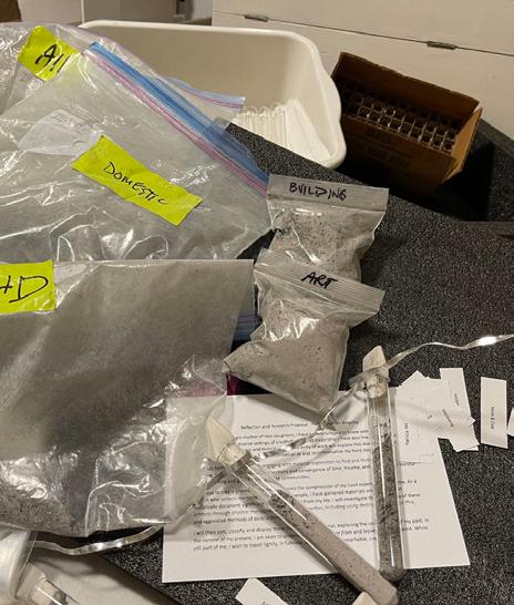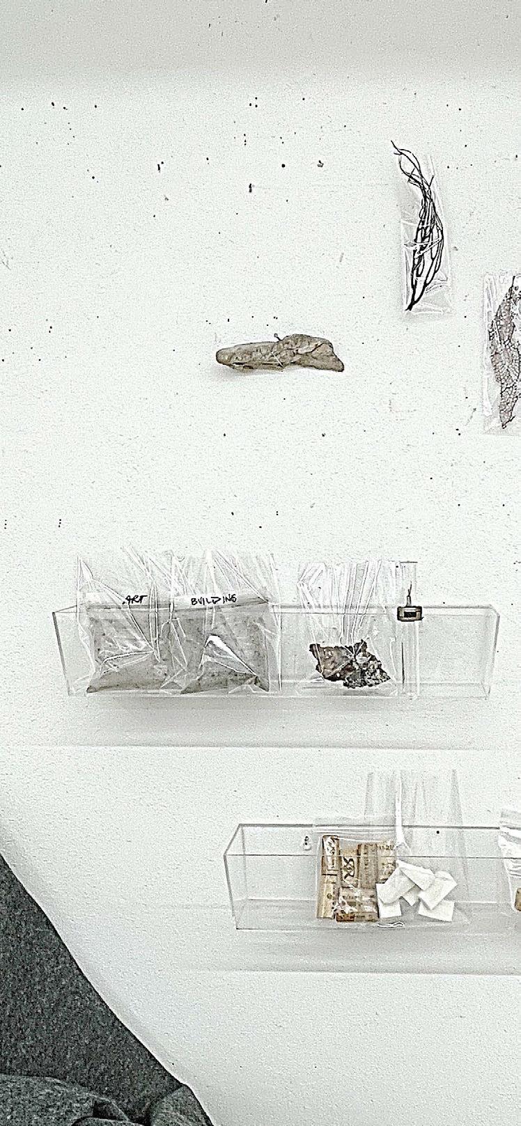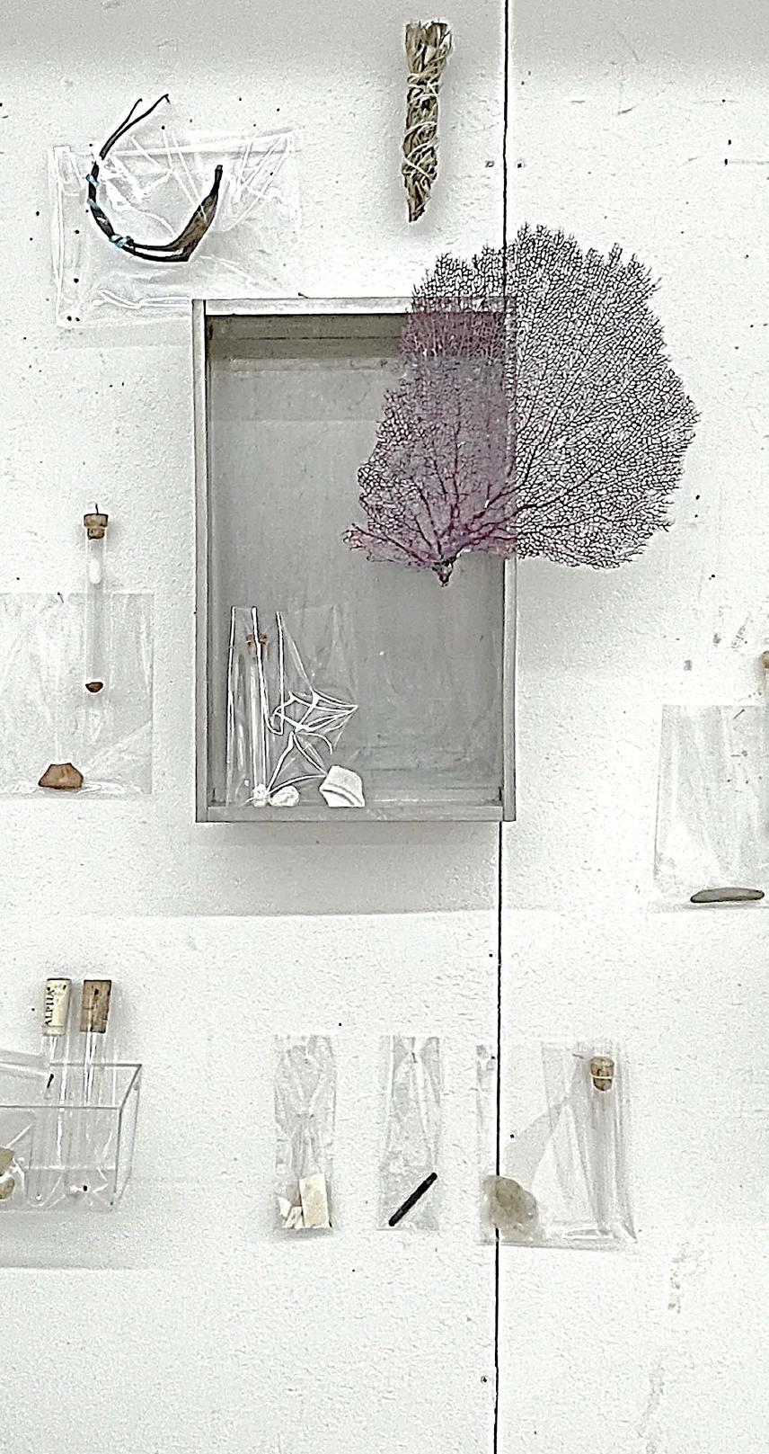 Wisdom gathers within our lived experiences, like elements assembled in a periodic table, identifying the science of living within our earthly shell, as materiality collects within the soul of our being and the sole of our shoes. Collected mementos, such as pottery shards, branches, or coral gifted by the earth, are elemental moments that anchor us. Seed pods, glass, and dried wood form mnemonic connections with the planet. These objects, ground into powders, infuse collected ash with expressive life stories across time in new forms.