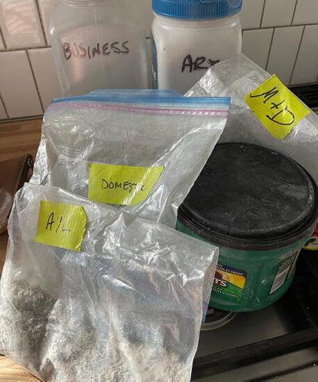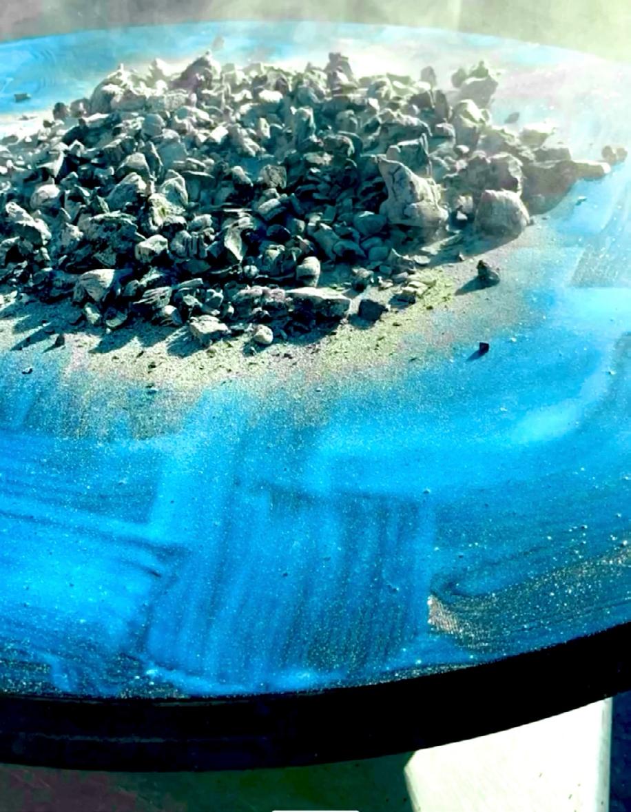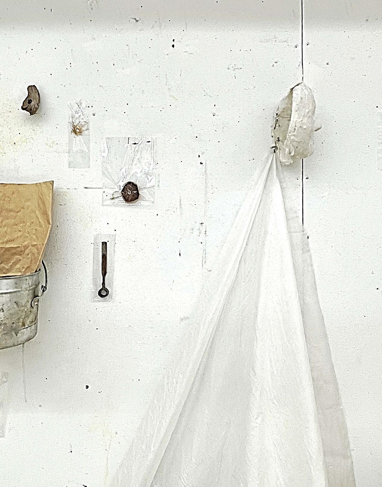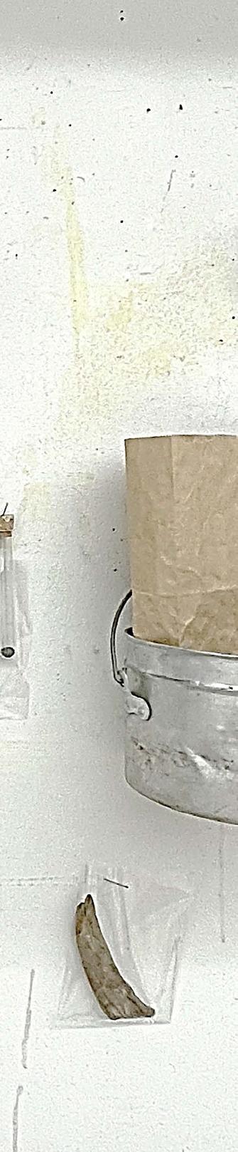 Wisdom gathers within our lived experiences, like elements assembled in a periodic table, identifying the science of living within our earthly shell, as materiality collects within the soul of our being and the sole of our shoes. Collected mementos, such as pottery shards, branches, or coral gifted by the earth, are elemental moments that anchor us. Seed pods, glass, and dried wood form mnemonic connections with the planet. These objects, ground into powders, infuse collected ash with expressive life stories across time in new forms.