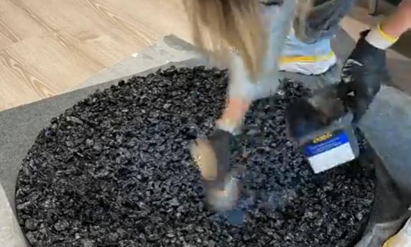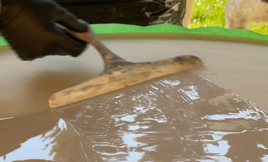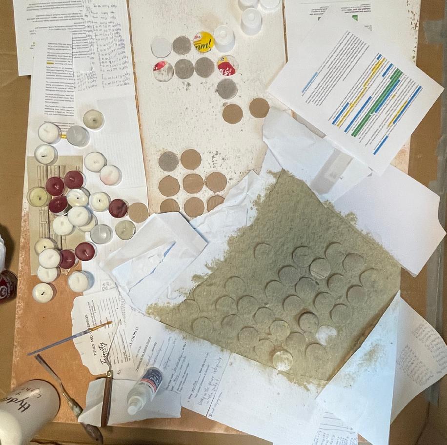 Recycled rubber fabrication template, crushed lavender, crushed charcoal, ground Turks and Caicos sea fan, gold leaf 30”x48”x1.5”