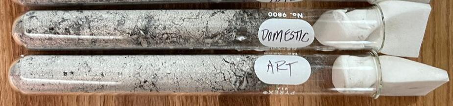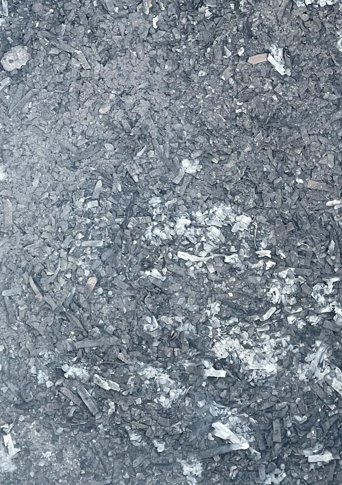 For me, there is always beauty in brokenness, whether the recognition of an unknown story in a piece of pottery found in a fence bottom, or along a sea edge. Coaxing ash to settle in place upon varying substrates of my choosing, or mixing ash with land elements from varying contexts in search of beauty, is the most di cult artwork I have ever completed.