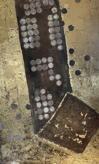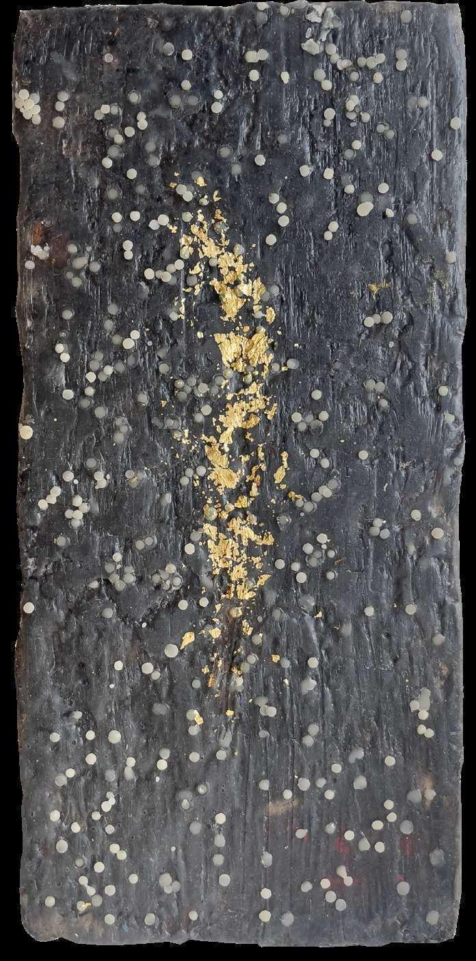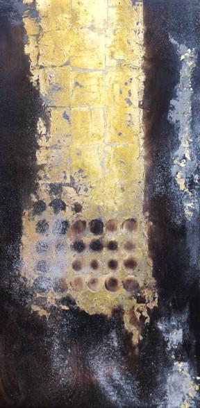 Recycled cardboard shipping forms, art and business ash, beeswax, damar varnish, gold leaf
