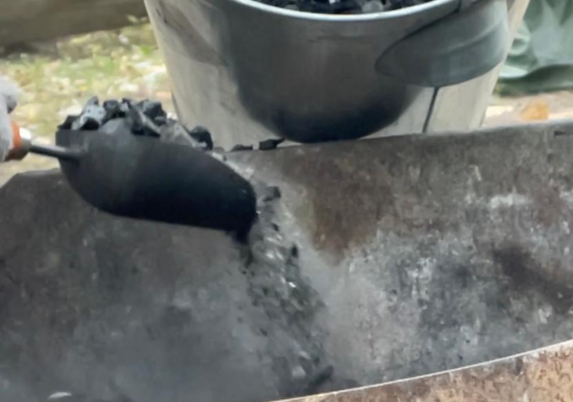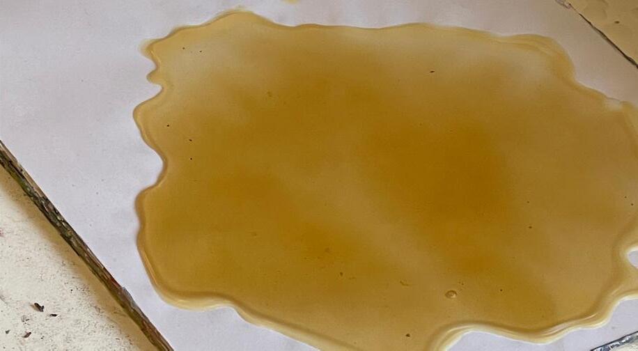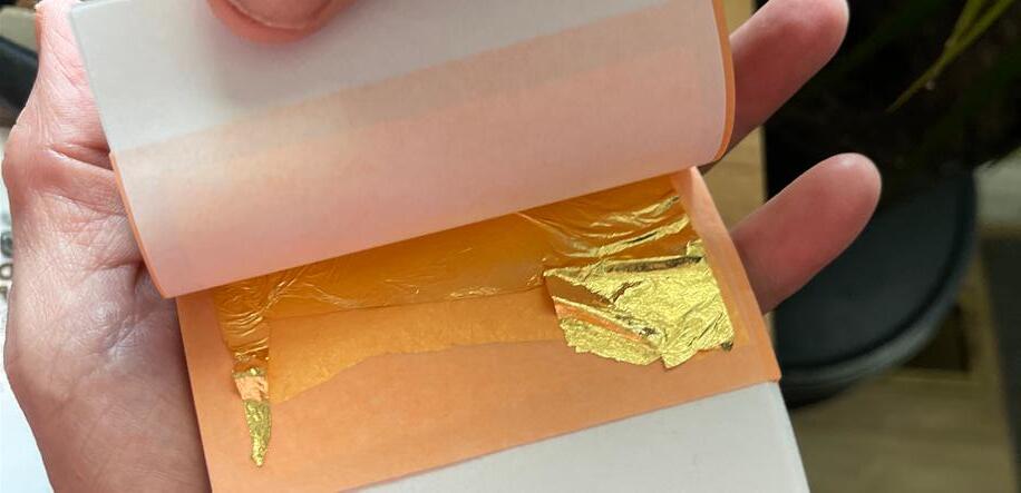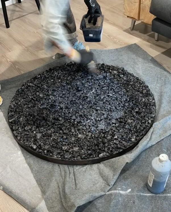 Ash, pouring medium, fixative, gold leaf, 36” Circle x 1.5”