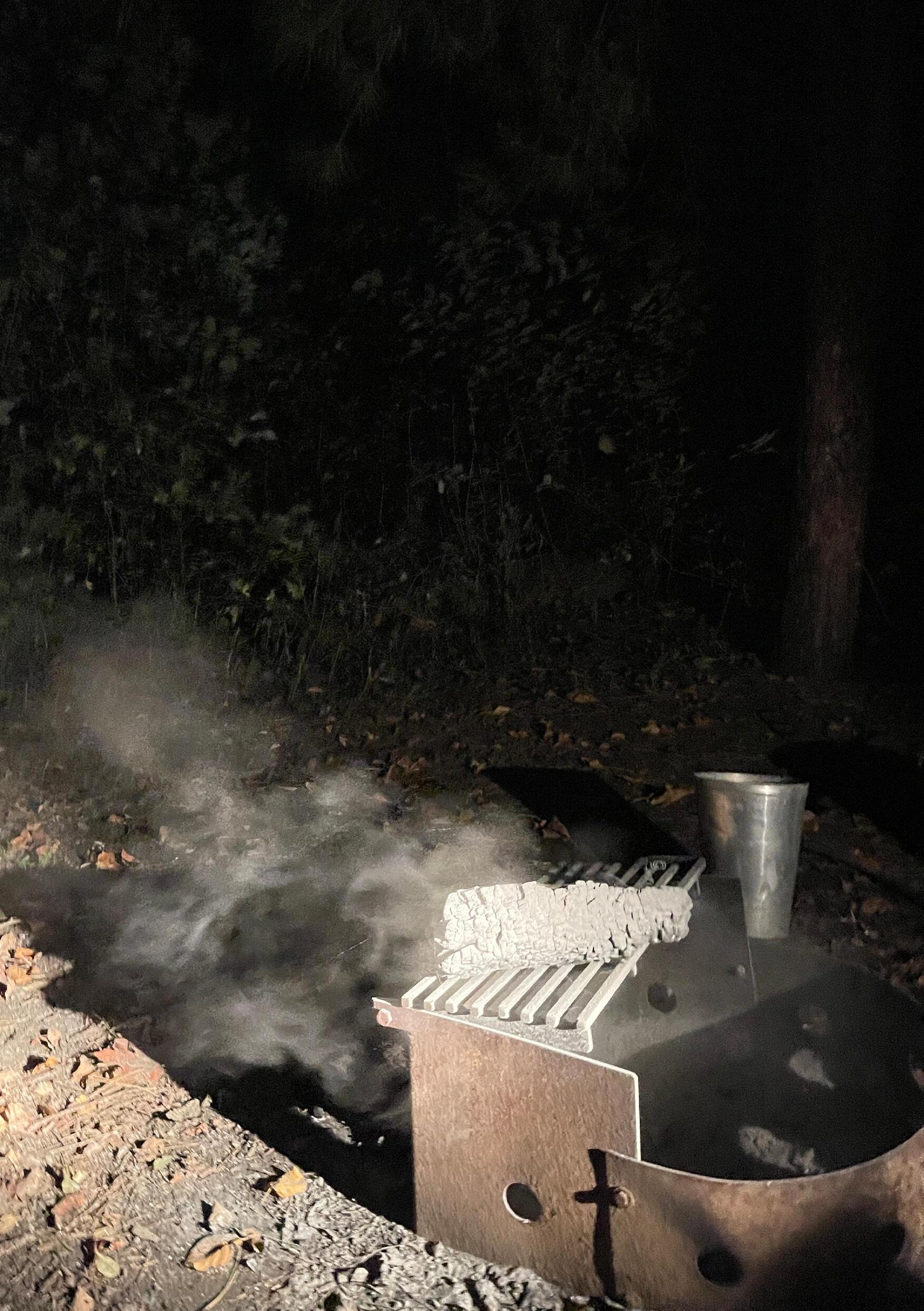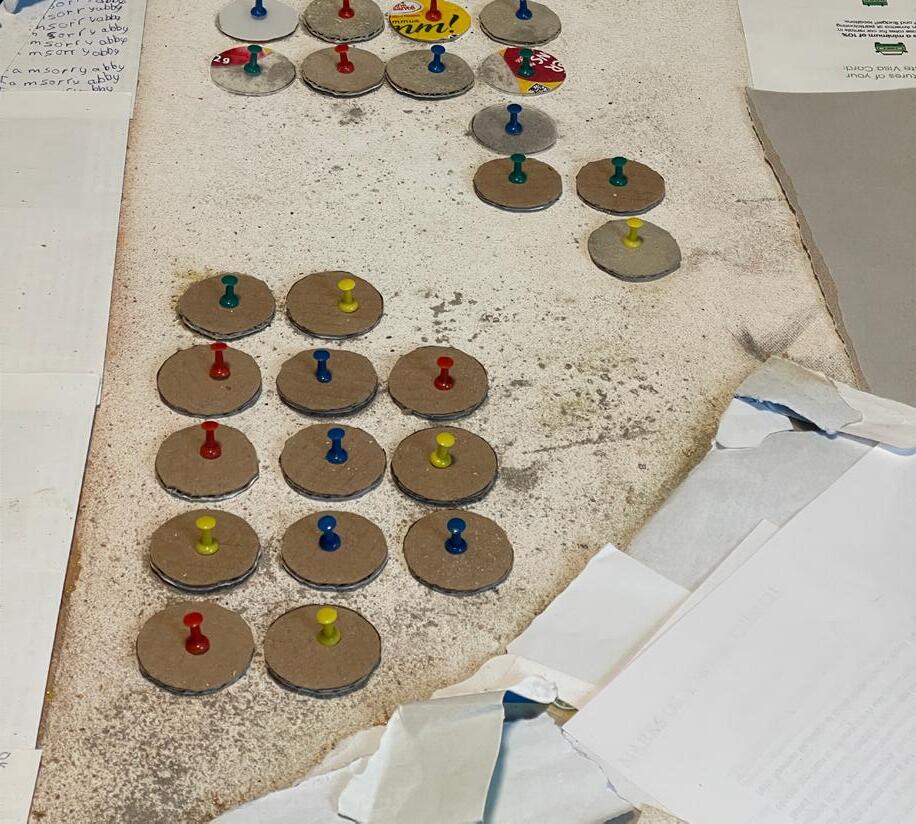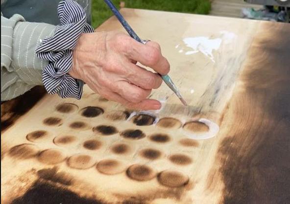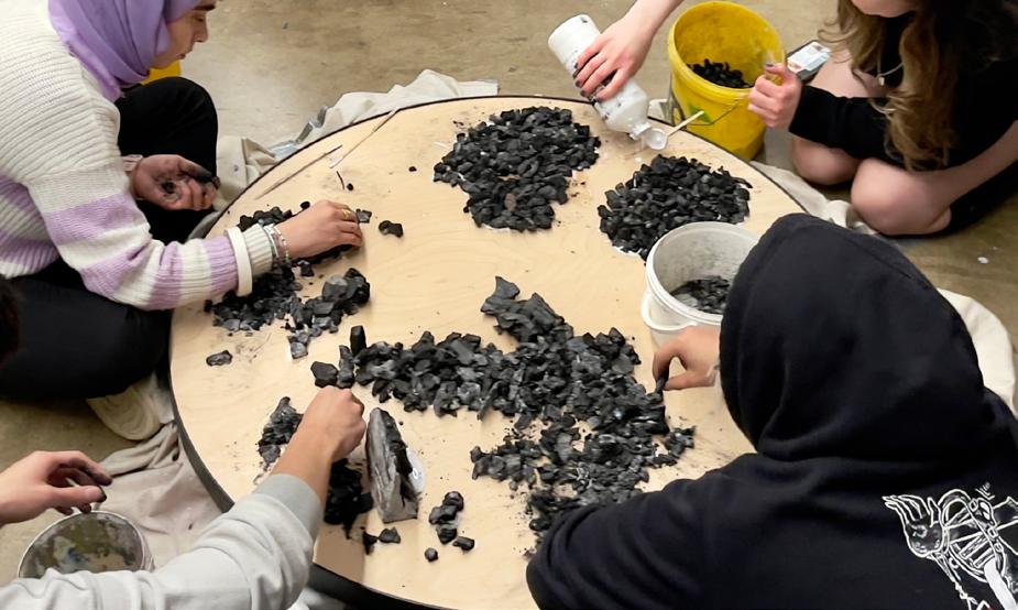 Making Space unfolded as part of a community remembering with colleagues, as part of two collaborative activations. Each person was invited to select a piece of charcoal and add it to the wood panel, thereby remembering themselves upon the wood panel. The first, an ever-evolving group of participants, sat on the ground in a circle around the substrate. Contributors added their piece and remained, conversing for two hours, experiencing community around this circle. It was re-released for finishing by the OCADU Mature Student Collective. We gathered in an eating area and placed the final pieces of charcoal in their homes on the wood while we shared stories, memories, and conversations as we remembered ourselves into this completed form.