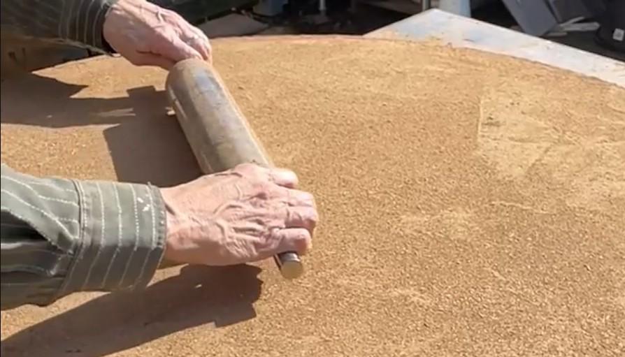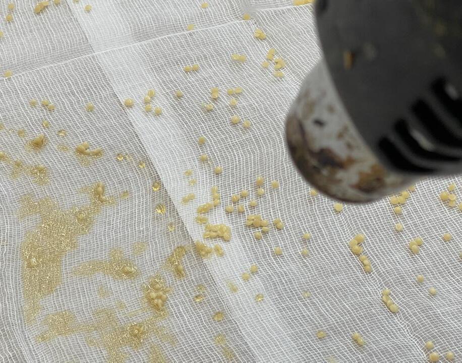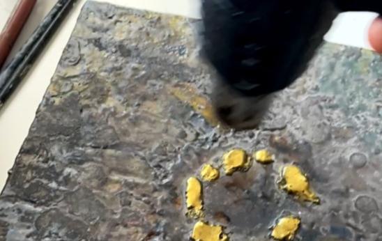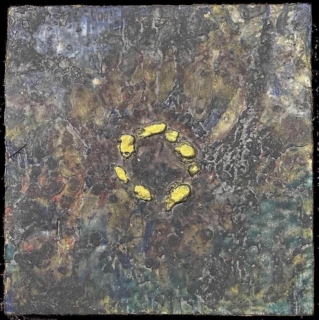 Polycrystalline wax, ash, gold powder, and an old sun ower painting on board 12”x12”