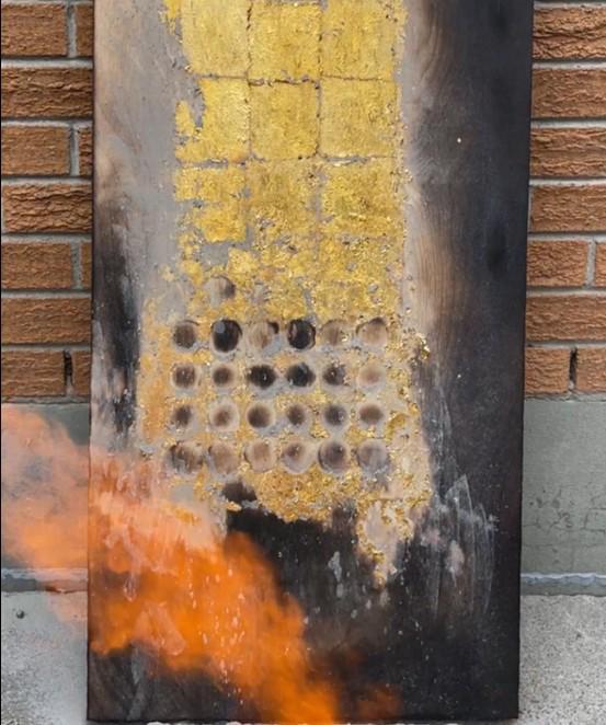 Fire, charcoal, heavy gel, gel medium, charcoal dust, and glazing medium on wood panel 36” x 1.5”