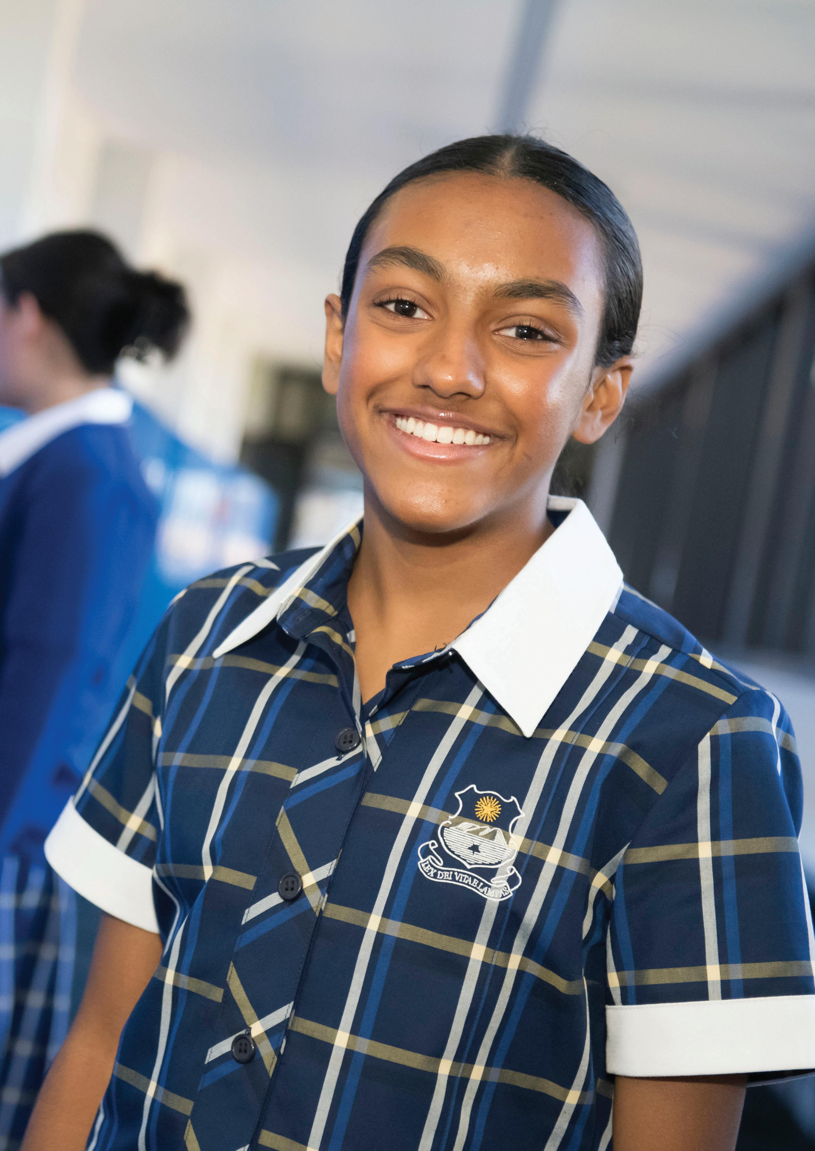 Ovindee Amarasiri wearing attire from PLC’s new transeasonal school uniform collection.