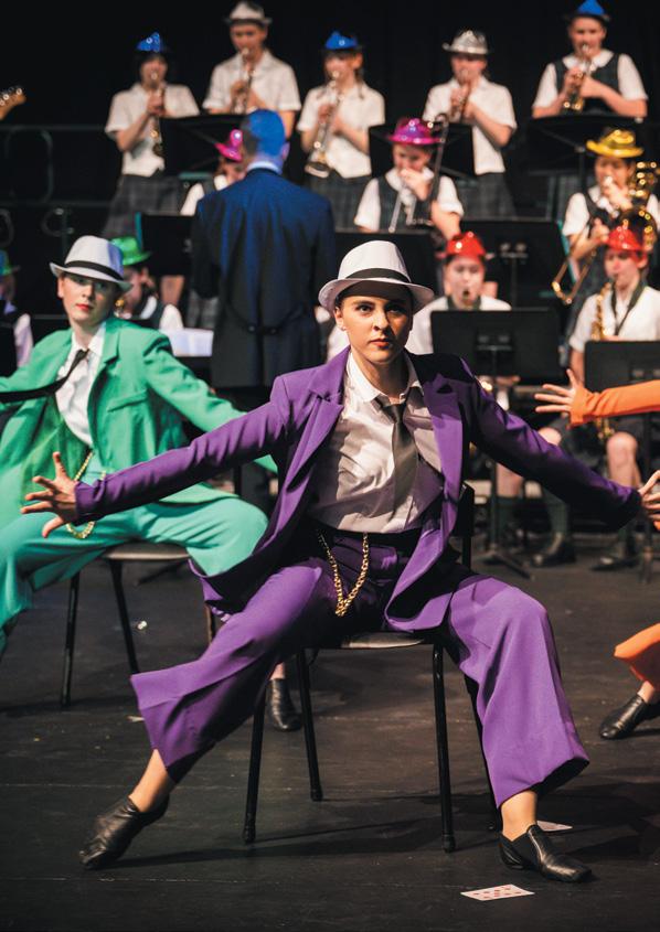 playing on stage as the crowd entered. The audience and Junior Concert Band were officially welcomed by the host of the night, the 2023 Music Captain Natalie Iacullo, who captivated the audience with her engaging MC manner. The Junior Concert Band was a perfect start to the festivities in the theatre and demonstrated the depth of talent in the PLC bands. The Senior Concert Band entered the stage to the sounds of the lone piper, Marina Ruan, performing on the Juliet Balcony high above the audience. The Concert Band performed their challenging repertoire including selections from West Side Story and “Never Gonna Give You Up” with finesse. It's certainly an amazing feat to be even attempting repertoire such as this.