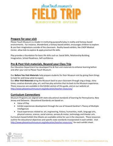 Pre & Post Visit materials, Beyond your Class Trip Our Education Department has developed Pre & Post visit materials to enhance learning before and after your visit to Please Touch Museum. Our Before You Visit Materials help prepare students for their Museum visit by giving them things to look for and know what to expect. Our After Visit Materials bring the Museum back to your classroom through sing-a-longs, story times, creative dramatic play, art, and free play activities that tie back to the Museum experience. These resources are available in the Exhibit section of this guide, and on our website at http://www.pleasetouchmuseum.org/education/teacher-resources/