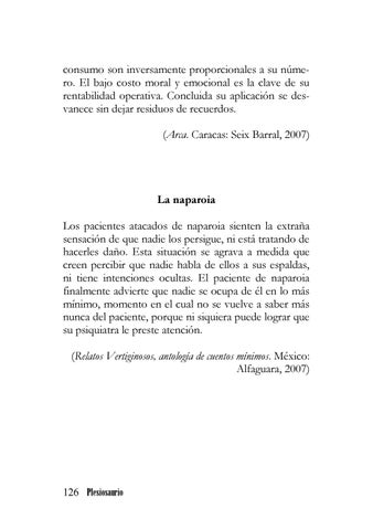 La naparoia Los pacientes atacados de naparoia sienten la extraña sensación de que nadie los persigue, ni está tratando de hacerles daño. Esta situación se agrava a medida que creen percibir que nadie habla de ellos a sus espaldas, ni tiene intenciones ocultas. El paciente de naparoia finalmente advierte que nadie se ocupa de él en lo más mínimo, momento en el cual no se vuelve a saber más nunca del paciente, porque ni siquiera puede lograr que su psiquiatra le preste atención. (Relatos Vertiginosos, antología de cuentos mínimos. México: Alfaguara, 2007)