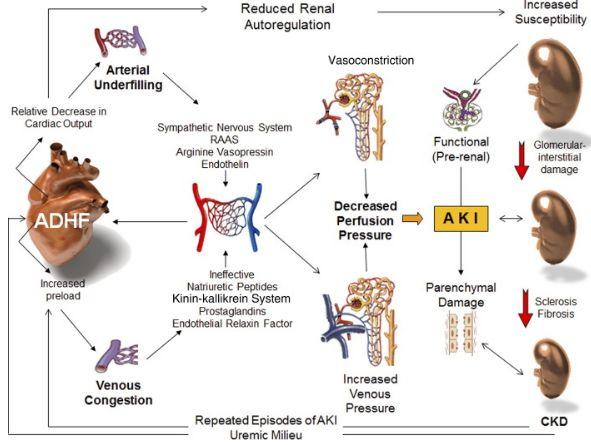 Acute decompensated heart failure (ADHF) via arterial underfilling and venous congestion causes a series of changesinendocrineandhemodynamicfactorsthatleadtoacutekidneyinjury(AKI).