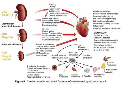 Hyperphosphatemia (> 4.5mg/dL) and secondary hyperparathyroidism in patients with CKD can cause the calcification of cardiac vessels and valves through “osteoblastic” transformation of vascular smooth muscle cells, hypertension can also contribute to vascular calcification and consequent pressure overload. CKD also contributes to CVD in CRS Type 4 by complicating pharmacological and interventional treatment. For instance, azotemia and hyperkalemiarestricttheuseofdrugsthatantagonizetherenin-angiotensinsystem.