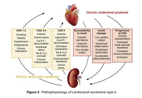 Pathophysiology of CRS-2 includes renal congestion and hypoperfusion combined with increased right atrial pressure, which is pathognomonic in kidney dysfunction of chronic heart failure patients. Patients with CRS type 2 also tend to have vascular calcification, decreased vascular compliance and more severe chronic organ injury. These are due to increased bloodpressureandstress.