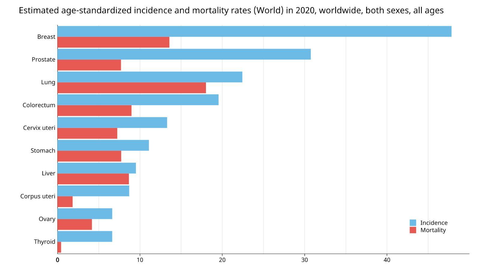 Figure 2. Cancer mortality and incidence according to the kind of cancer (2020) (IARC, T., 2020)