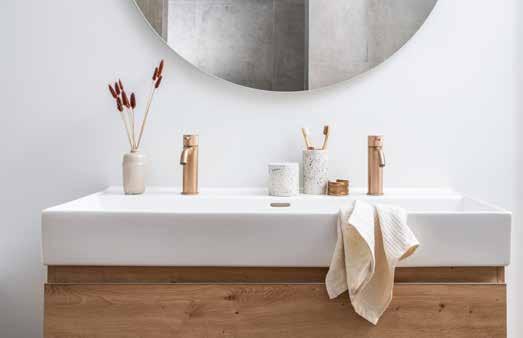 Kansas onderbouwkast Vintage Oak met greeploos afgeschuind RVS gecombineerd met een Kansas wastafel matwit en een Roma wastafelkraan in geborsteld rosé goud.