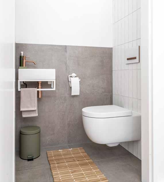 Houston Frame in matwit met een Houston fontein, een toiletkraan Roma in geborsteld rosé goud en een wandcloset Kansas in matwit.