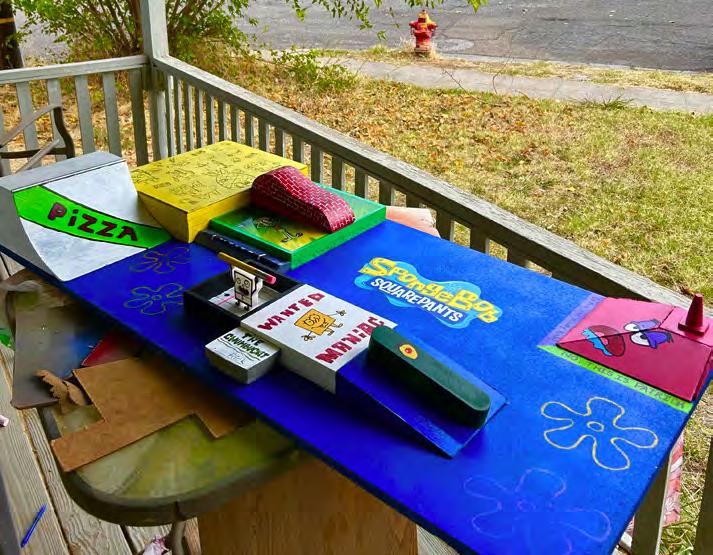 Rob now shares his enthusiasm with his four-year-old son, Oliver, bonding over skateboarding and fingerboarding sessions. This connection has made fingerboarding more than just a personal hobby—it’s become a family tradition. Building on his background in carpentry, Rob began creating custom fingerboard parks about a year ago, combining his skills with his creative vision. One of his standout projects was a SpongeBob-themed park, built alongside Oliver and inspired by their shared love for the show. The park’s colorful and whimsical design highlights Rob’s creativity and craftsmanship while creating a special memory with his son.