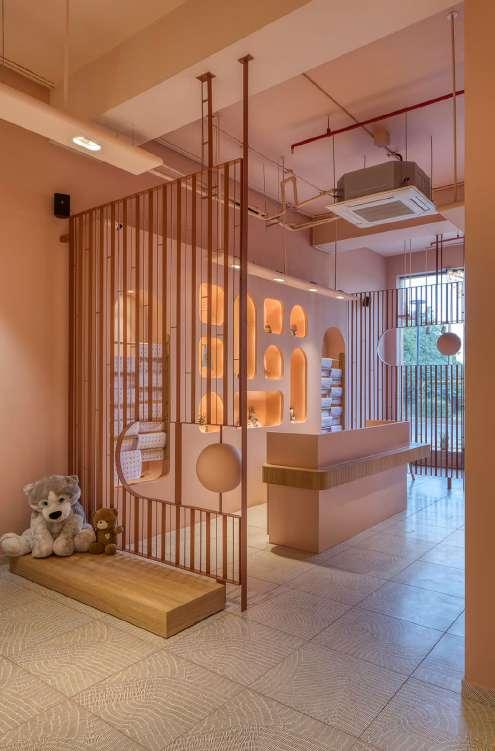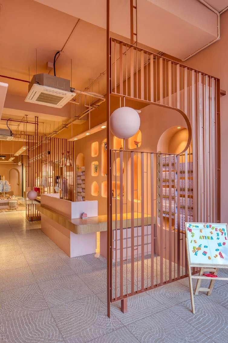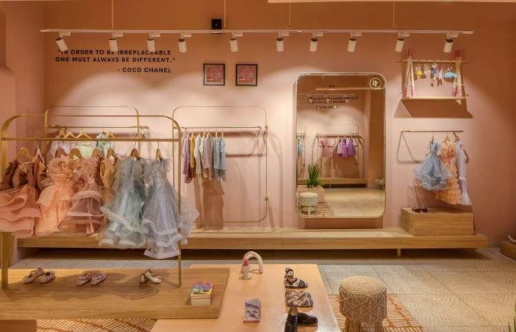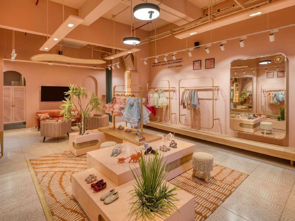 Evoking the feeling of joy and playfulness, the store is an attempt to be an engaging place for both the adults and children. The muted colour palette further enhances the garments displayed and other accessories