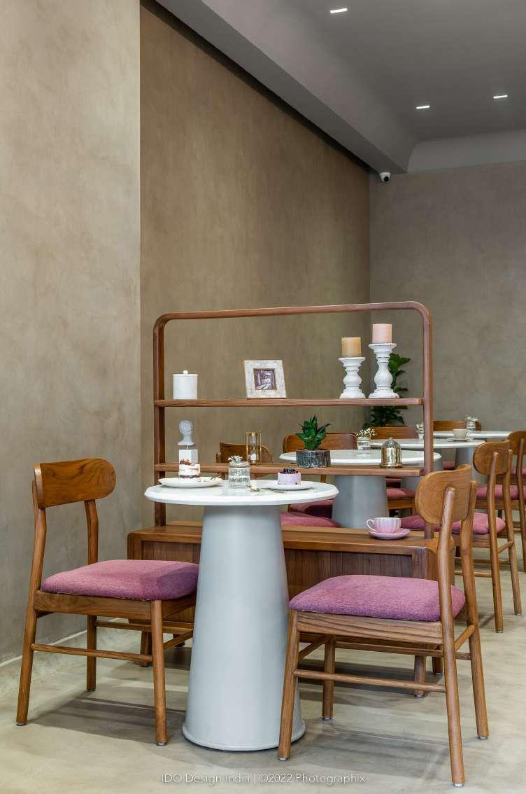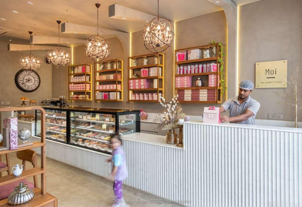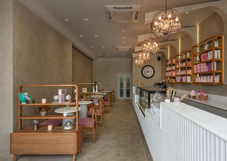 The furniture elements follow a similar language, soft edges and subtle curves paired with matte textures to create a comfortable and inviting space. The grey front façade with fluted and clear glass panels to lend a partial view of the neutral space and colorful desserts. Upon entering, one is invited into the warm and cozy ambience, the neutral shell of which acts as a blank canvas against which the desserts