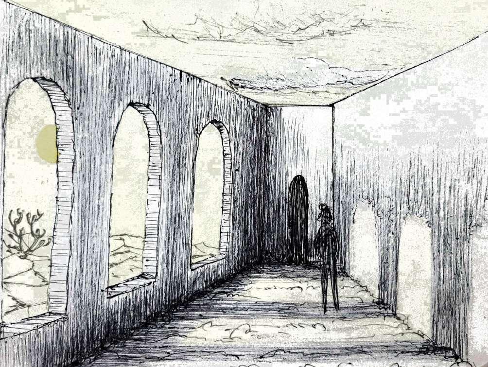 The dream house is constructed on the memories of the childhood home. the long walls made from the earth down below, are made so high that ambient amount of light is penetrated through the openings made in them, these openings small or large creates an amazing play of light and shadows, the long narrow alleys create this perfect peripatetic paradise that helps me wander and dream, these alleys hide the perfect corners that I take refuge to.