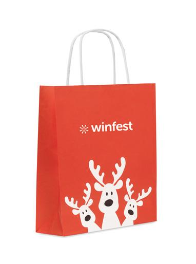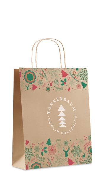 Christmas medium gift paper bag (50% recycled) bag. 90 gr/m². Made in EU. Size 25x11x32 cm Print technique Screen printing,T1,DL,TD,TR