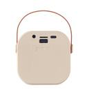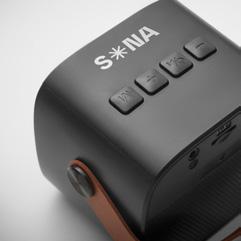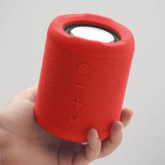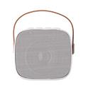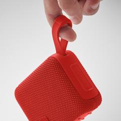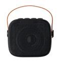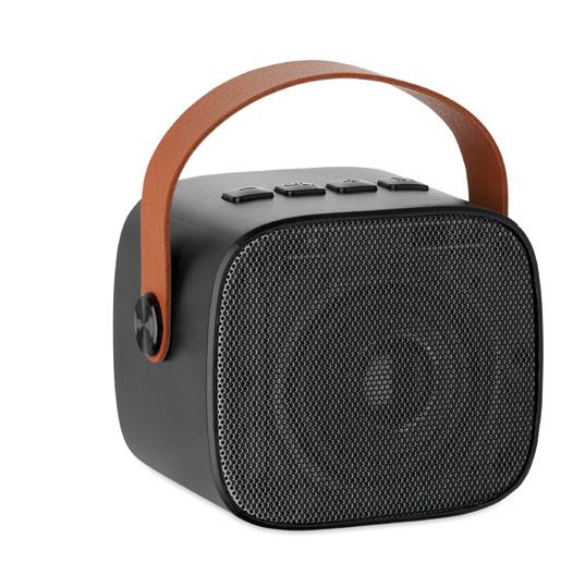 5.0 wireless speaker in recycled ABS with PU handle. Rechargeable Li-ION 500 mAh battery included. Includes an SD card port and an AUX/ USB cable. Output data: 5W, 3 Ohm and 5V. Playing time approx. 4h. Size 8,6x6,5x7,5 cm Print technique Pad printing,DL,DO1,L,S,B