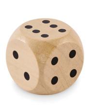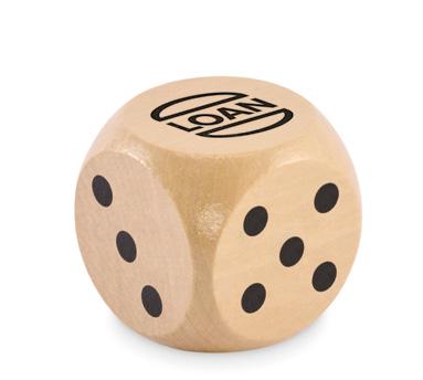 Dice in schima wood. 5cm diameter. This item can only be delivered in multiples of inner packaging being 25 pcs. 1 side reserved for printing. Size 5x5x5 cm Print technique Pad printing,L