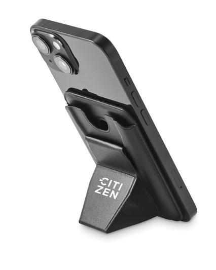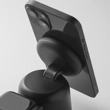 3 in 1 charging station in ABS. Includes 15W magnetic wireless charger for phone and TWS with phone holder functionality and smartwatch charger (Apple® only). Magnetic feature compatible with iPhone® 12 and newer. Including additional magnetic metal ring to support charging of other non-magnetic wireless chargeable phones. Size 10,2x7,1x12 cm Print technique Pad printing,DL
