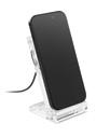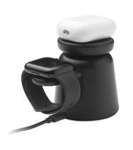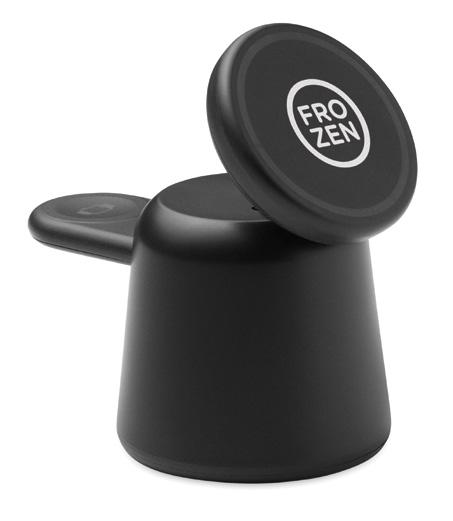 3 in 1 ABS charging station. Magnetic wireless charger 15W with phone stand, TWS charger and smartwatch charger (Apple® only). Compatible with iPhone® 12 and newer. With additional magnetic metal ring to support charging of non-magnetic wireless chargeable phones. Size 130x70x18 cm Print technique Pad printing,DL
