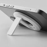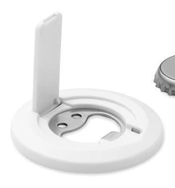 Magnetic phone holder and stand with bottle opener. Compatible with iPhone® 12 and newer. Including additional magnetic metal ring to support charging of other non-magnetic wireless chargeable phones.
