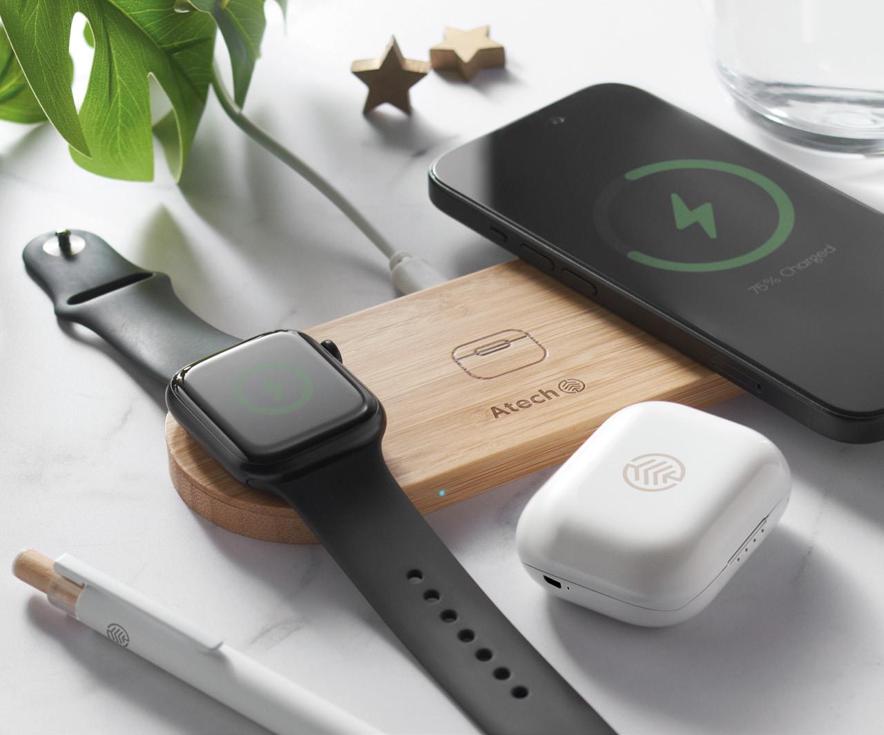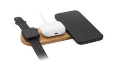 3 in 1 charging station in bamboo case. It includes a wireless charger 15W, smartwatch charger (Apple® only) and TWS charger. Size 16,8x6,4x0,8 cm Print technique Pad printing,L,DL