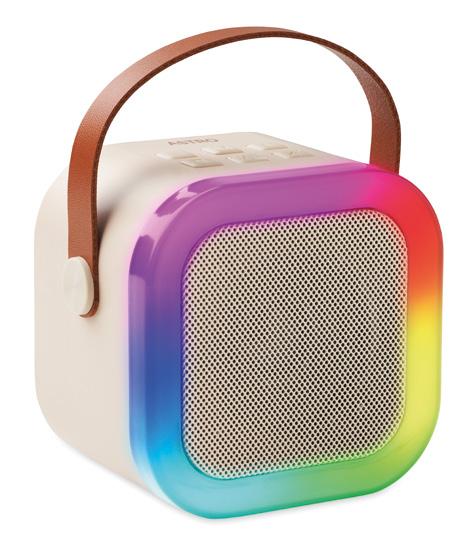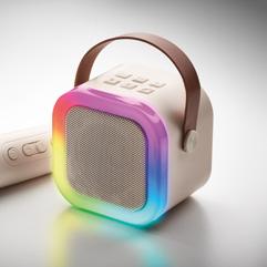 Karaoke set including 5W wireless speaker with LED changing colours light in recycled ABS with PU handle and microphone. Built-In 800 mAh battery speaker and 400 mAh battery microphone. Playing time approx. 3h. Size 8,5x9x6,5 cm Print technique Pad printing,DL,DO1,L,S,B
