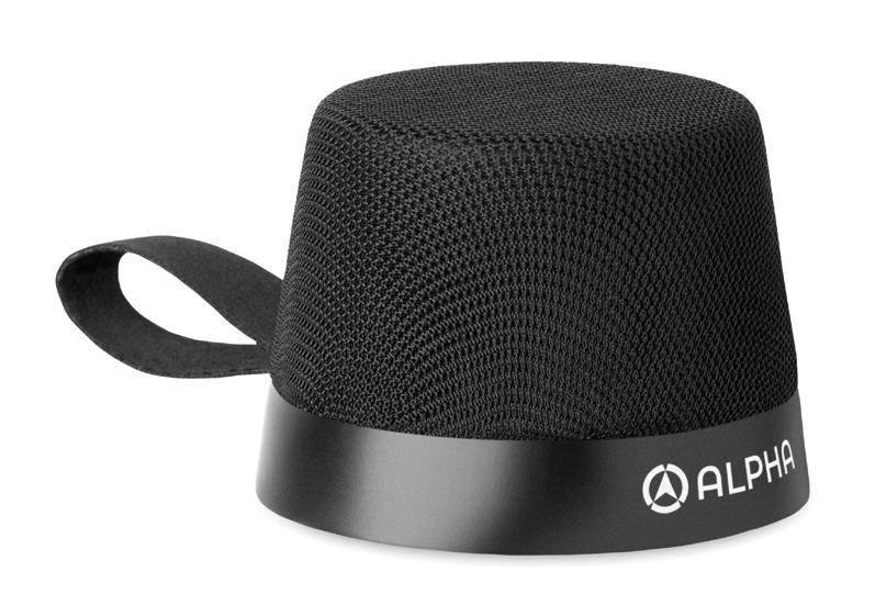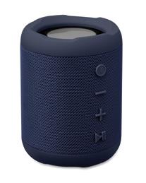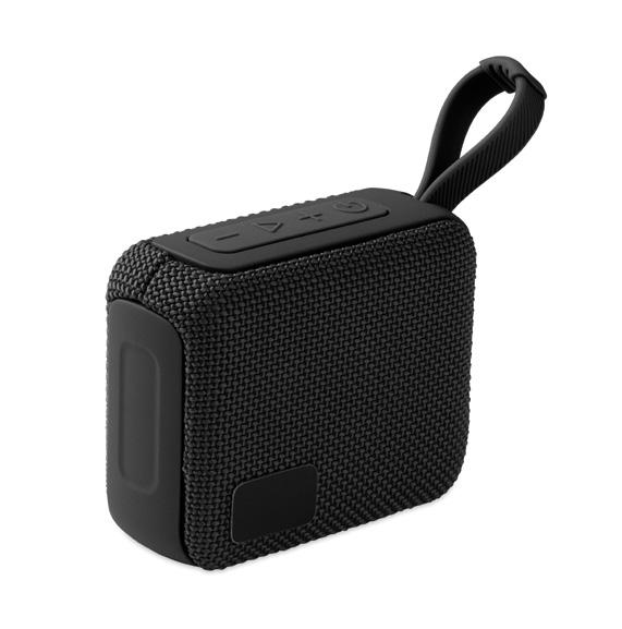 5.0 wireless speaker in ABS with RPET fabric. Rechargeable Li-ION 800 mAh battery included. Includes an SD card port and an AUX/ USB cable. Output data: 5W, 3 Ohm and 5V. Playing time approx. 3h. Size 11x8,5x8,5 cm Print technique Laser engraving,DL,DO1