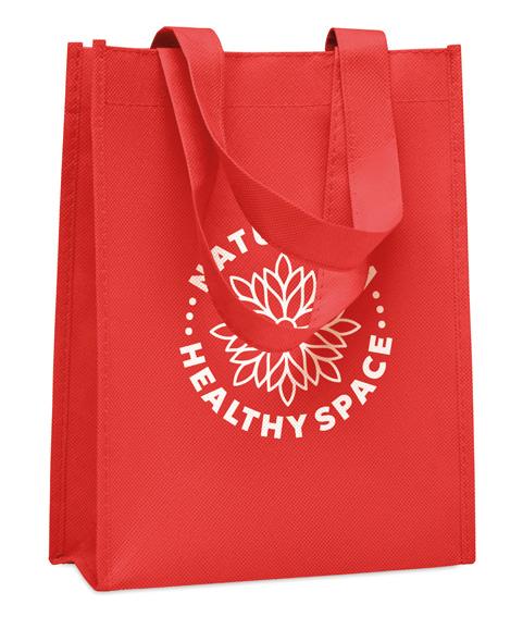 Small gift or goodie bag in RPET non-woven with short handles and gussets. 80 gr/m². Size 20x8x25 cm Print technique Screen printing,T1,TD,TR