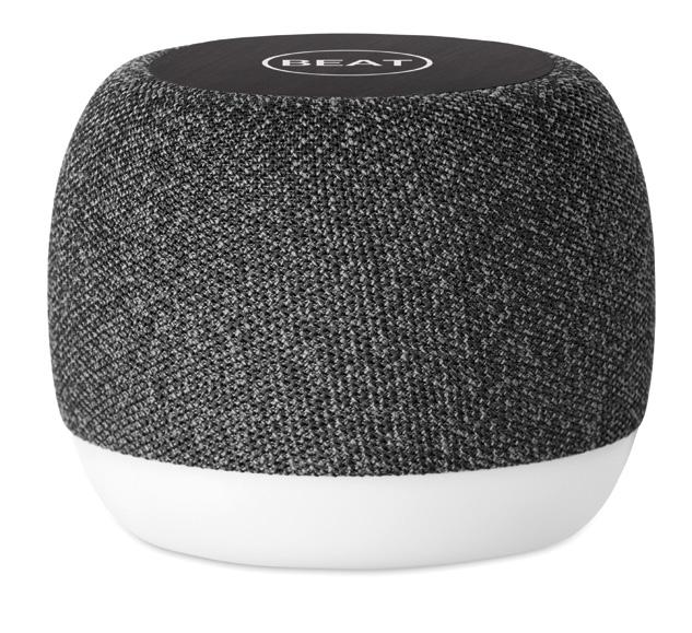 5.0 wireless speaker and 15W wireless charging in ABS and RPET fabric and black coated bamboo detail on top. Rechargeable Li-ION 1200 mAh battery included. Includes an SD card port and an AUX/ USB cable. Output data: 5W, 3 Ohm and 5V. Playing time approx. 5h. Size 10,8x9,2 cm Print technique Pad printing,L,S,DL,DO1