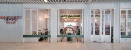 By evoking a healthy rural farm environment to refect the ethos of local produce brought to table. Light colour tones, cheery signage, cleanly simple furnishings and a thematic trellis with actual greenery conspire to cast the salubrious glow over the three seating zones. The conceptual sidewalk cafe, garden courtyard or windowside viewing spots are subtly outlined within the overall vibe. An entry facade of corrugated walls and white french doors start it all, forest green metal chairs or cabinetry complemented by blond wood and timber fooring round things of. A feature wall display showing cataloguing herbs and microgreens grown and used by Something Wild keep everyone’s mind on the subject.