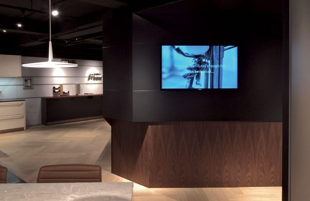 The metal piece begins at the showroom entrance and morphs into a large reception counter, where the darkness is complemented by subtlety of veneers. The piece then folds into a signage wall at the focal zone, the primary area that displays the brand’s top-notch builtin products. Beside the signage wall is the video wall, which brightens up the open setting of the meeting zone. The metal then folds again and transforms into a transition portal, through which customers can learn of the brand’s second product line. •