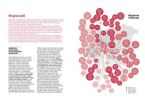 different regions and an interactive website will be created where users can experience the fairy-tales in an interactive format; ► Workshops between participating international artists will transform the collected material into a series of artistic interventions in the mountain villages. An example of this will be the Rhodope Labyrinth project by the Bulgarian theatre company 4TUNES in collaboration with international partners such as FLUXUS 2, UNIVERSITUR, and Asociatia Smart for Change which will create interactive sensory-labyrinth performances, based on anthropological studies of the region. An online platform will document and support the organisation of the different stages of the project. The work with local contributors and audiences will build capacities and develop new practices for cultural participation. ► Processing the collected material into a travelling-theatre programme, storytelling performances and concerts which will be presented on different routes throughout the Rhodope Mountains. ► The climax of the festival will be in the Rhodope village Gela with intercultural projects such as site-specific installations,