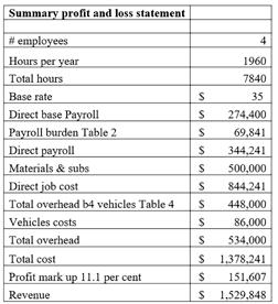 Here are some questions for you: Do you prepare an annual budget? Do you have a realistic method of establishing your labour charge out rates? Do you have realistic methods for marking up materials, subs and equipment for sale? How do you determine how much profit you would like to make? Is it based on a reasonable return on investment (ROI)? How often do you compare your actual performance to the budget? If youdoconstructionwork,haveyoueverusedthedualoverheadrecovery process?(Mostwon’tevenknowwhatthatmeans,butithasbeeninusein the United States since the 1990s.) Do you do monthly work in progress (WIP) reports? Do you have a realistic understanding of the value of your business?