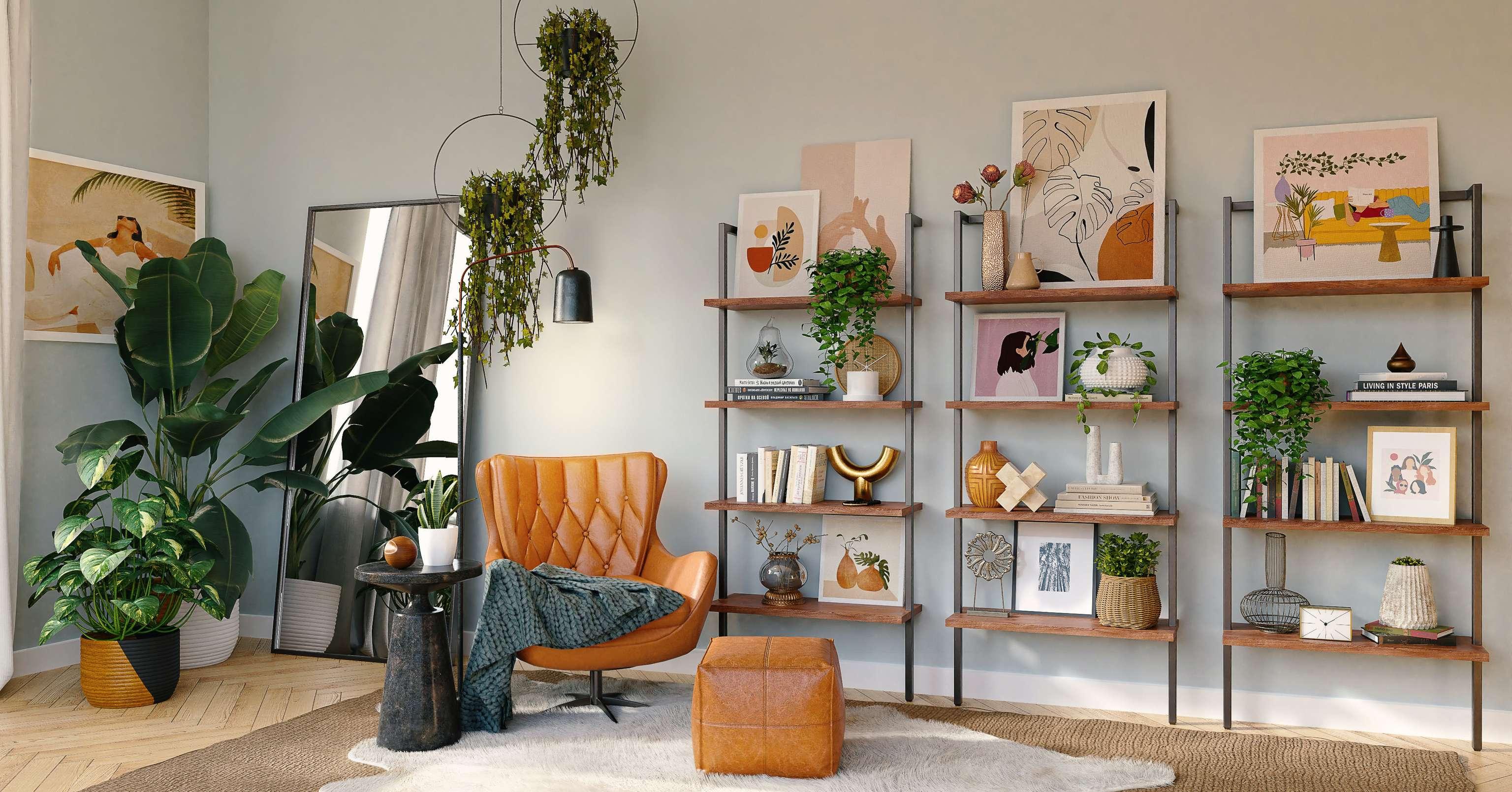 Balance flat or horizontal lines – bookshelves, back of the sofa, tables – with taller or vertical lines – floor lamp, wall art, tall plant.