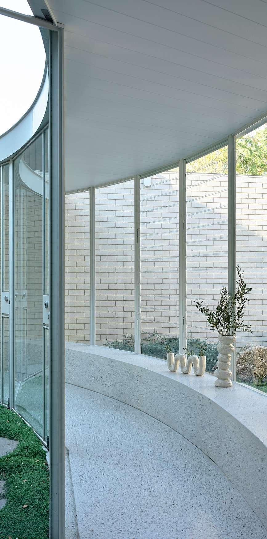 On a warm day, the series of pivot steel doors and louvre windows can be opened, transforming the space to perform more similar to an exterior bench and verandah.