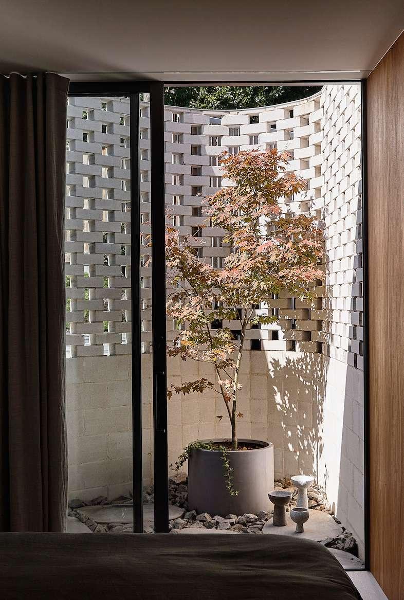 The lace-like brick theme is also used downstairs as a screen, in a smaller pebbled courtyard, accessed via a guest bedroom This allows light into the guest bedroom and adds a beautiful visual element The remaining downstairs area has the capacity to house guests comfortably and ensures visitors have their own privacy and space, both indoor and outdoor.