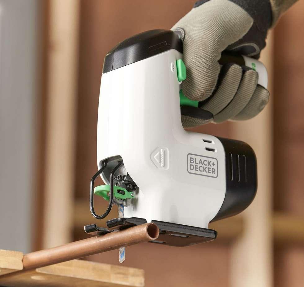 Built for power and flexibility, the reviva™ Jigsaw is constructed from recycled materials, incorporating the equivalent of 18 singleuse plastic water bottles[6] Light and compact in form factor, it can cut up to 8M2 on a single charge.[7] This versatile cordless Jigsaw enables precise and effortless cutting around profiles, curves and corners in wood, metal and plastic. A variable speed trigger allows finger-tip control, while its slim ergonomic handle and low 1.4kg weight make it suitable for working in narrow or restricted spaces