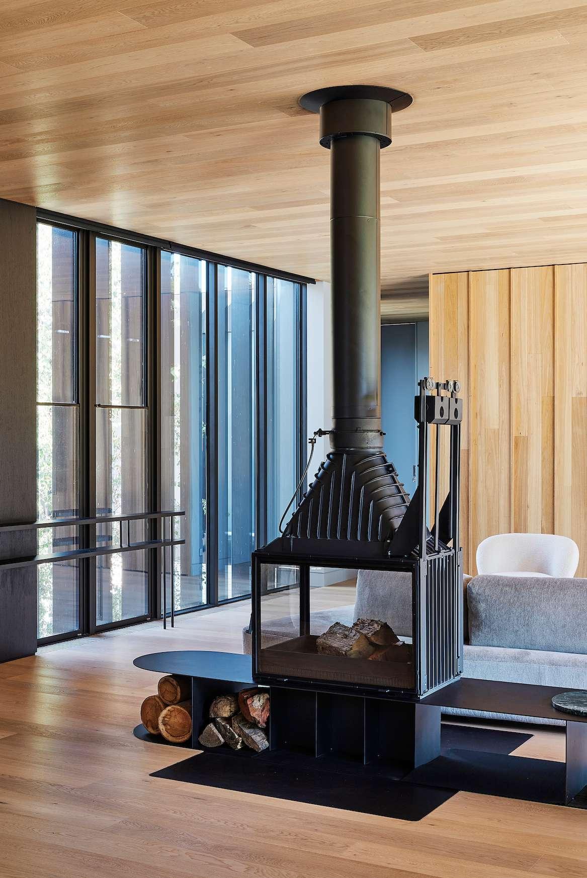 The family wanted the space to remain comfortable when they were all together whether there was just the two of them or more To give an intimate feel, dark interior tones within the space were incorporated - dark wood walls, wooden cabinets, timber ceilings and floors, and dark details on fireplaces and bookshelves. The style between the two floors is deliberately subdued, minimal and restrained