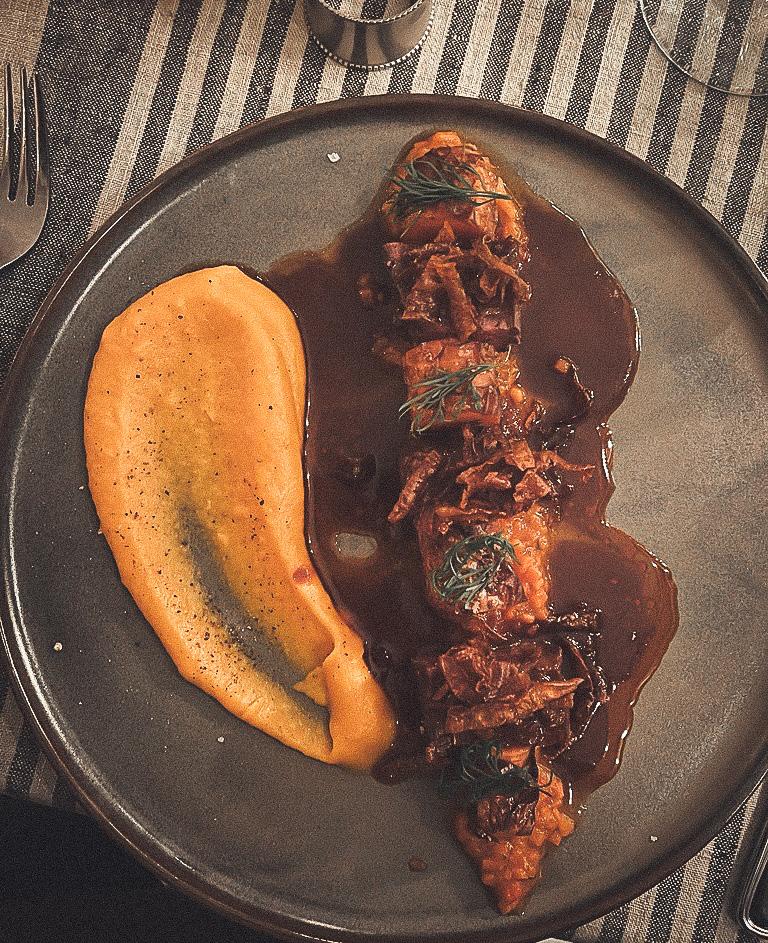 Den innovativa processen minskar också andelen kött på tallriken. I en råbiff kan hälften av köttet bytas ut mot rödbeta. ”På så sätt kan vi ta ner mängden animaliska proteiner och samtidigt bevara smaken och texturen på råbiffen”, säger Conny. Att matfilosofin har ett fokus på grönsaker handlar därmed också om att minska mängden animaliska produkter, av bland annat hållbarhetsoch klimatskäl, men utan att snåla på upplevelsen.