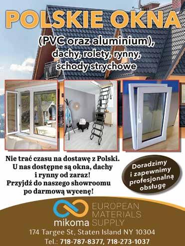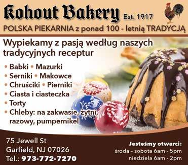 15 lat z Wami! REKLAMA 46 Przyjdź i przekonaj się o naszych WIELKICH zniżkach! 66 Fadem Road, Spring eld, NJ 07081 Tel.: 973-379-4662, Fax: 973-379-4933 sales@schmalzs.com www.Schmalzs.com Pośpiesz się - promocyjne ceny czekają Godziny otwarcia: wtorek, środa, czwartek, piątek 10am-3pm sobota 7am-1pm Bogaty wybór wędlin własnego wyrobu, przygotowywanych codziennie w naszej masarni ❖ wędzona kiełbasa ❖ kabanosy ❖ krakowska ❖ ❖ wędzony boczek ❖ smoked bu s ❖ salceson ❖ mortadela Podwawelska $3.99 za funt Ceny obowiązują tylko i wyłącznie w naszym sklepie rmowym Kaszanka $3.19 za funt Polędwica Sopocka (bez folii próżniowej) $4.59 za funt Polski świeży chleb $6.29 za bochenek SUPER SPECJALNE CENY! PLUS 14 marca 2024