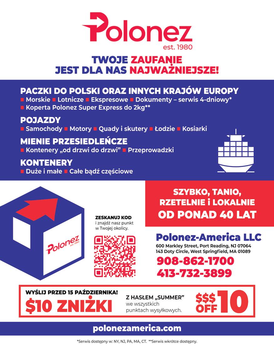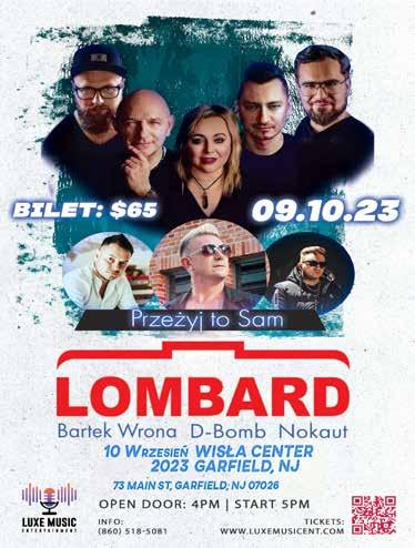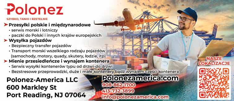 15 lat z Wami! REKLAMA 16 Przyjdź i przekonaj się o naszych WIELKICH zniżkach! 66 Fadem Road, Spring eld, NJ 07081 Tel.: 973-379-4662, Fax: 973-379-4933 sales@schmalzs.com www.Schmalzs.com Pośpiesz się - promocyjne ceny czekają Godziny otwarcia: wtorek, środa, czwartek, piątek 10am-3pm sobota 7am-1pm Bogaty wybór wędlin własnego wyrobu, przygotowywanych codziennie w naszej masarni ❖ wędzona kiełbasa ❖ kabanosy ❖ krakowska ❖ ❖ wędzony boczek ❖ smoked bu s ❖ salceson ❖ mortadela Podwawelska $3.99 za funt Ceny obowiązują tylko i wyłącznie w naszym sklepie rmowym Kaszanka $3.19 za funt Polędwica Sopocka (bez folii próżniowej) $4.59 za funt Polski świeży chleb $6.29 za bochenek SUPER SPECJALNE CENY! PLUS 28 sierpnia 2023