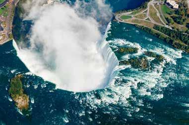 Niagara Falls to właściwie trzy wodospady. W ostatnim fragmencie przed spłynięciem ze skarpy rzeka Niagara podzielona została w natu ralny sposób na dwie odnogi przez niewielką wyspę. Goat Island (Kozia Wyspa) została tak nazwana po tym, jak podczas srogiej zimy w 1780 roku zamarzło na niej stado kóz, należące do jednego z pierwszych tutejszych osadników Johna Sted mana. Największy z wodospadów, ze względu na podobieństwo kształ tów nazwano Horseshoe (podkowa). Jego krawędź ma długość 740 m i spływa nim 90% wody Niagary. Dwa mniejsze znajdujące się po