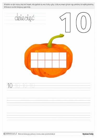 W tabelce na dyni narysuj taką ilość kropek aby zgadzała się z liczbą u góry. Liczbę w prawym górnym rogu pokoloruj lub wyklej plasteliną. W liniaturze na dole kontynuuj zapis liczby.