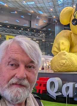 No i w końcu lądujemy na Mię dzynarodowym Lotnisku Hamad w Doha, mając za sobą 13 godzin lotu i 7,132 mile (12 tysięcy kilo metrów) pod skrzydłami! Zapada zmierzch, kiedy wysiadamy do au tobusu podstawionymi na betono wą płytę schodami. Jest pogodnie i ciepło, 30 stopni Celsjusza (90F), świeci Księżyc, i wszędzie dookoła widać znaki zbliżających się pił karskich mistrzostw świata FIFA QATAR 2022. Robimy pamiątkowe zdjęcia i wchodzimy na ogromny terminal zachwycający oryginal nymi rozwiązaniami. Media en tuzjastycznie rozgłaszały, że od dzisiaj, 1 listopada, przestają obo wiązywać kowidowe restrykcje, ale bez najdrobniejszej wzmianki, że na miasto mogą wyjść tylko osoby związane z FIFA i kibice z bi letami. Tak więc zamiast nocnej objazdówki uroczego centrum Doha, mamy bite siedem godzin na dokładne poznanie lotniska. Terminal jest ogromny; mnóstwo sklepów markowych firm, wysta wy kapiące złotem i pachnące per