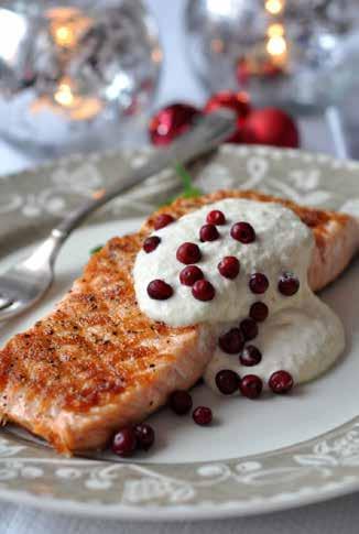 Rybę posól i popieprz, skrop oliwą i usmaż z obu stron, na złoto, na patelni grillowej. Śmietankę połącz z cukrem i ubij (nie na sztywno, ma być gęsta jak kwaśna śmietana). Dodaj chrzan, dopraw solą i wymieszaj. Na kawałek ciepłej ryby nałóż porcję sosu. Możesz przybrać świeżymi jagodami borówek lub natką pietruszki.